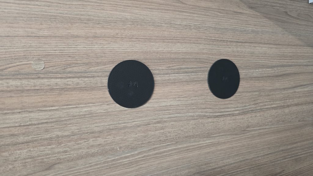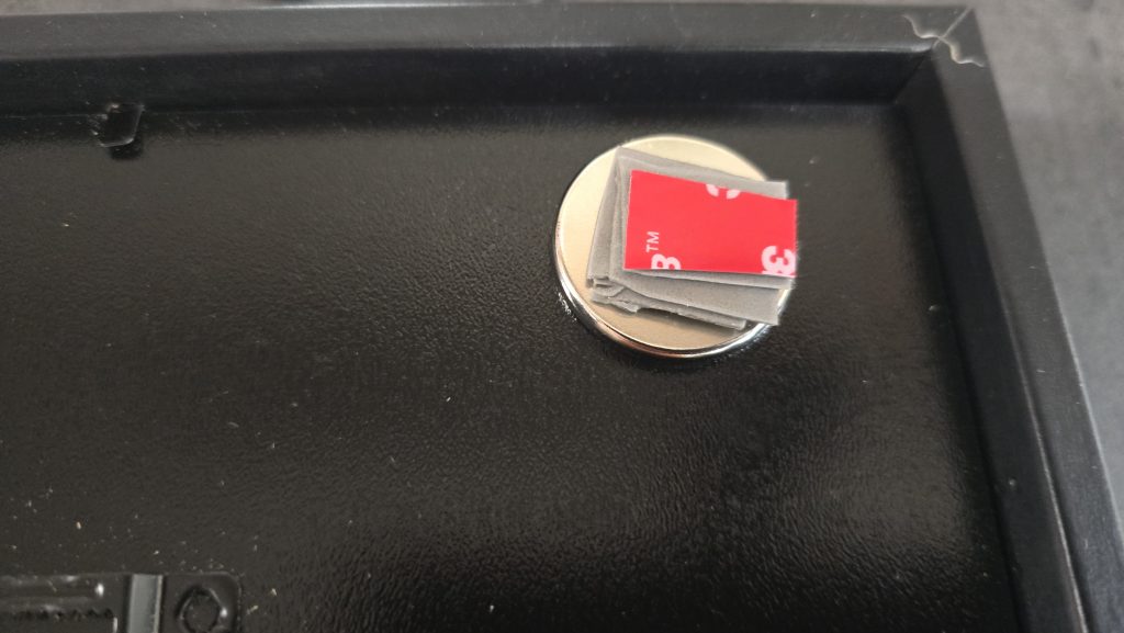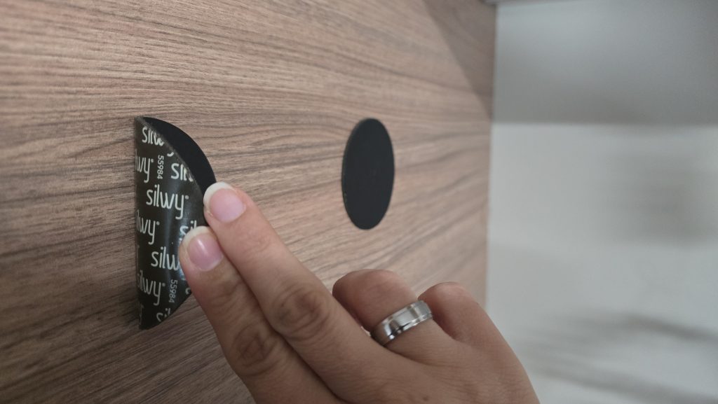 Um die richtige Höhe zu finden, haben wir die Pads auf den Magneten positioniert, dann die Schutzfolie abgezogen und sie direkt mit dem Bild an der richtigen Stelle platziert. Anschließend haben wir das Bild nochmal vorsitichtig abgenommen, damit die Pads ein bisschen anziehen konnten.