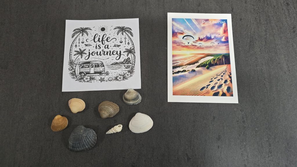 - kleine Dekogegenstände (z.B. Muscheln, eine kleine Flasche mit Sand, Urlaubs-Magnete oder andere Souvenirs, Trockenblumen etc.)
