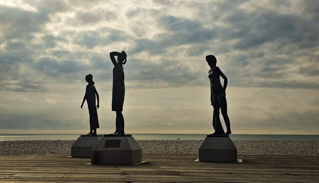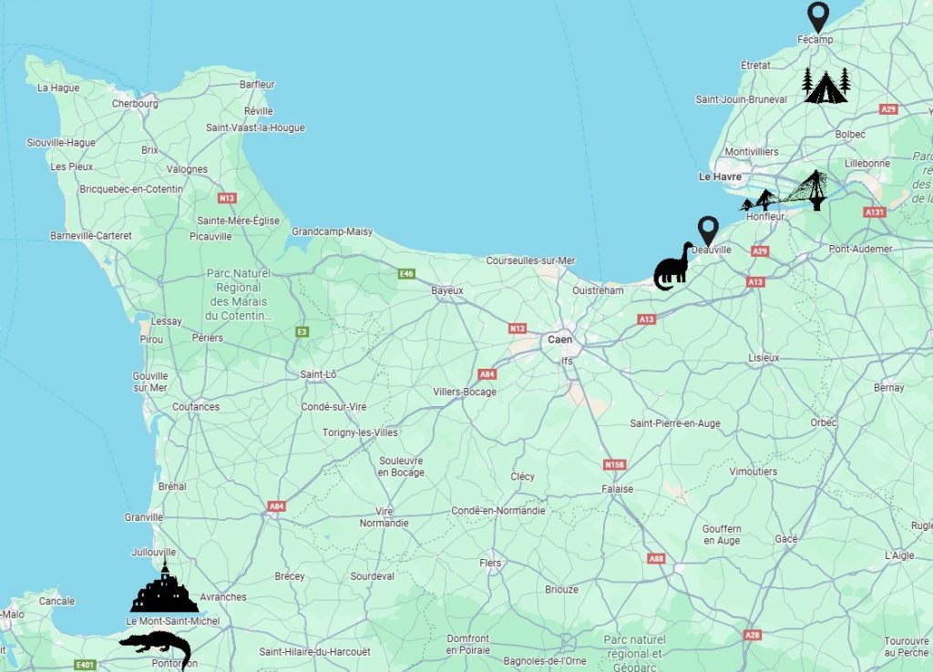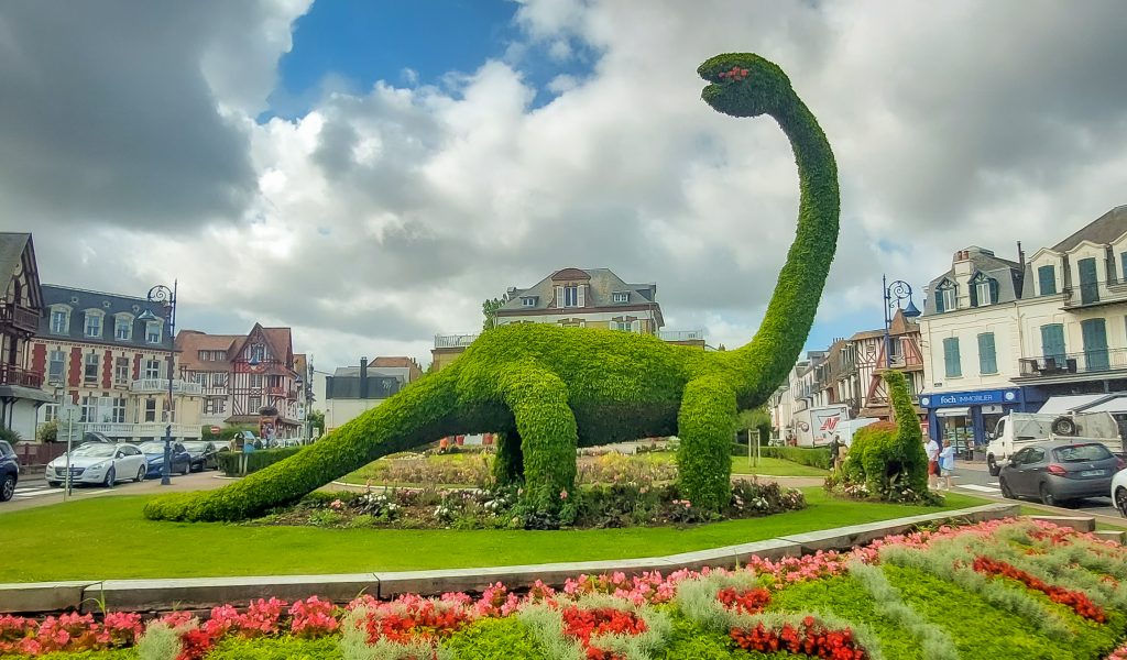 Ganz in der Nähe liegt auch Villers-sur-Mer, ein charmantes Küstenstädtchen, das etwas ruhiger und familiärer wirkt als das schillernde Deauville. Hier fanden wir die perfekten Muscheln für unsere Sammlung und genossen die entspannte Atmosphäre. Das Wahrzeichen des Ortes sind übrigens zwei riesige Dinosaurier-Skulpturen aus Pflanzen. Dinos trifft man in diesem Ort an jeder Ecke.
