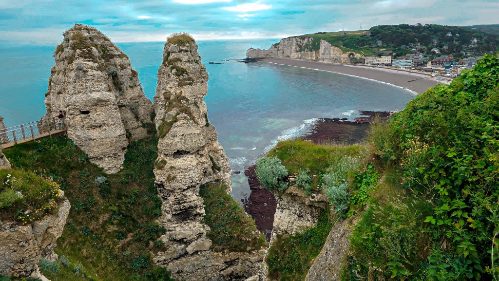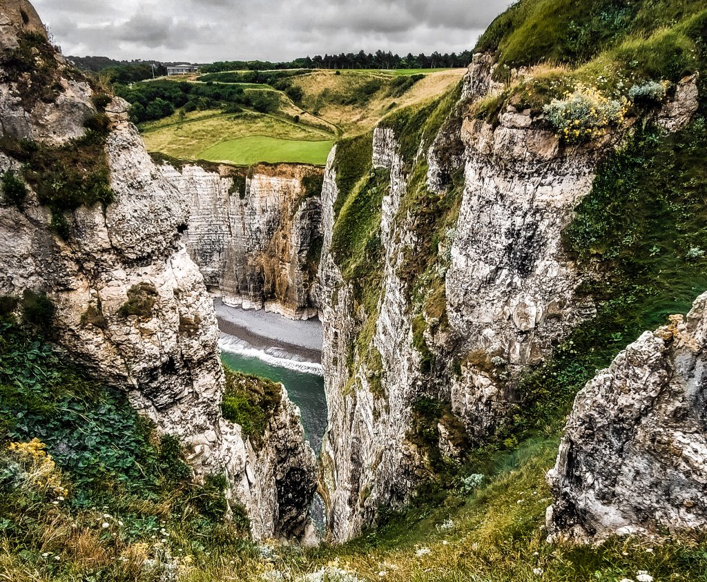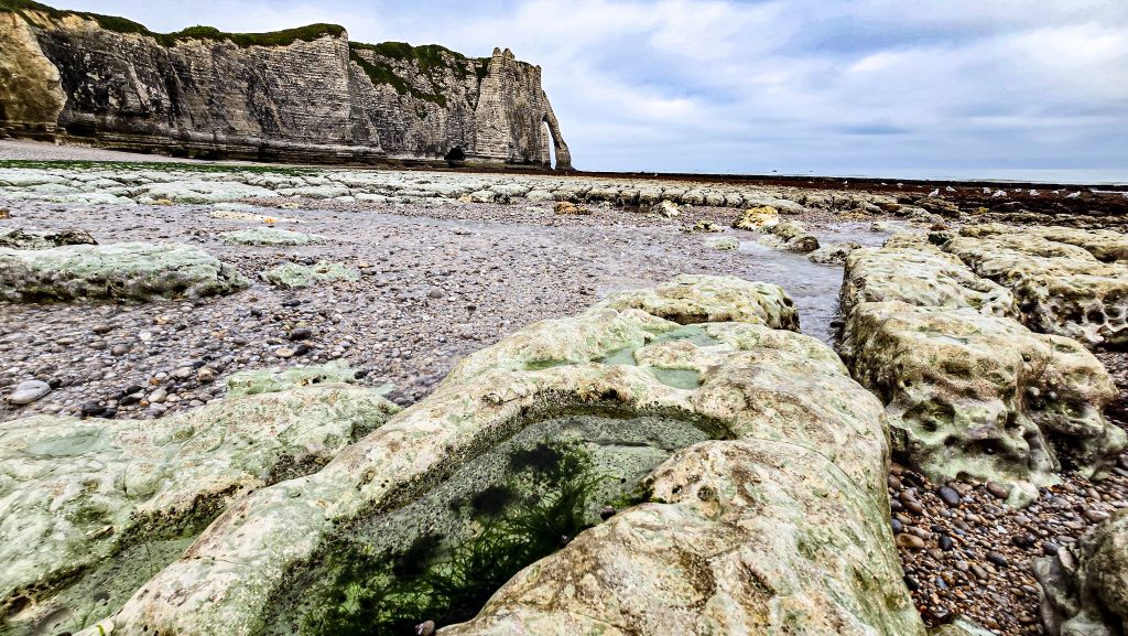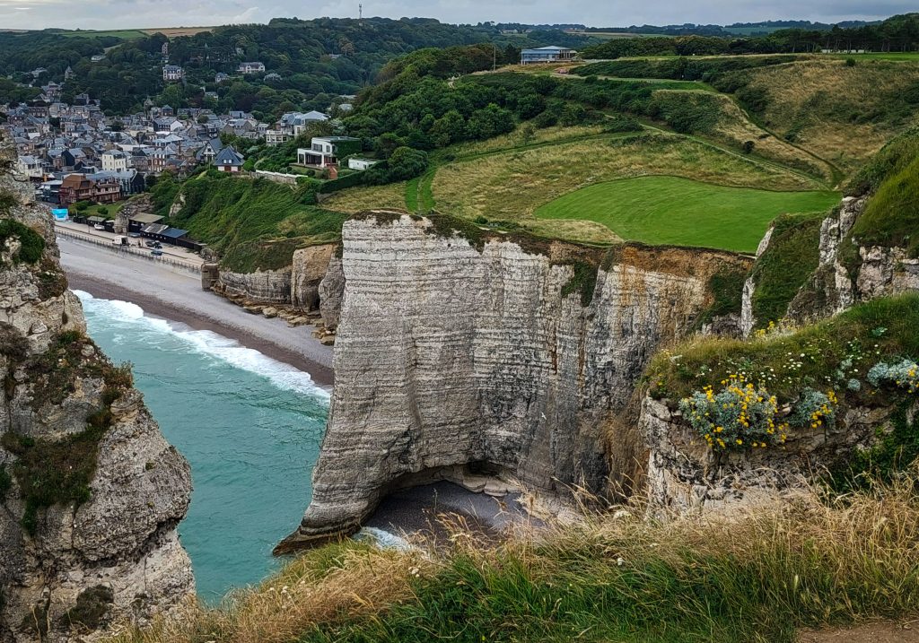 Unser Abenteuer begann in Étretat, einem wahren Juwel an der Alabasterküste. Die kleine Stadt selbst ist recht unscheinbar. Parkplätze liegen etwas außerhalb der Stadt und sind die einzige Möglichkeit um zu den Klippen zu gelangen. Besonders in der Hochsaison sollte man früh hier sein, denn der Andrang ist groß. Hat man eine Parkmöglichkeit gefunden und ist durch den Ort spaziert zeichnen sich die ikonischen Kreidefelsen, die wie gigantische Skulpturen aus dem Meer ragen, am Horizont ab. Der Anblick der Porte d’Aval, der Porte d’Amont und der beeindruckenden Aiguille Creuse ist einfach atemberaubend. Wir können nur jedem empfehlen, den Aufstieg auf die Klippen zu wagen – die Aussicht von oben ist einfach unvergleichlich. Man fühlt sich winzig klein angesichts dieser Naturgewalten. Wir haben stundenlang einfach nur aufs Meer geschaut und die Gischt auf unseren Gesichtern gespürt. Oberhalb der Klippen hat man einen fantastischen Blick über den Ort Ètretat und mit etwas Glück sichtet man sogar mal einen Seehund im Wasser. Die Wege sind recht gut befestigt aber ein bisschen Kondition sollte man mitbringen. Wie weit man auf den Klippen wandert ist natürlich jedem selbst überlassen. Wir würden auf jeden Fall die Strecke zum L’OEil du Panda – einem Fenster im Stein – empfehlen.