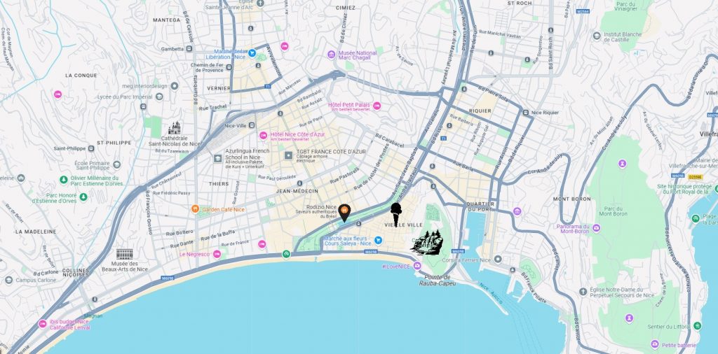 In den verwinkelten Gassen der Vieux Nice (Altstadt), wo der Duft von Socca (einem lokalen Kicherbsenteigfladen) in der Luft liegt und bunte Wäscheleinen zwischen den alten Steinhäusern flattern kann man unheimlich toll flanieren und sich beim Sightseeing verlieren. Hier pulsiert das echte Leben, hier kannst du in charmanten Bistros einen Pastis genießen und dem lebhaften Treiben zusehen. Unser Tipp: wer in Nizza ist sollte unbedingt einen Abstecher zur Eisdiele „Azzurro Artisan Glacier“ in der Rue Sainte Reparate einplanen und ungewöhnliche Sorten wie Rose, Lavendel oder Strawberry-Cheesecake probieren.