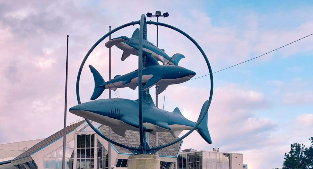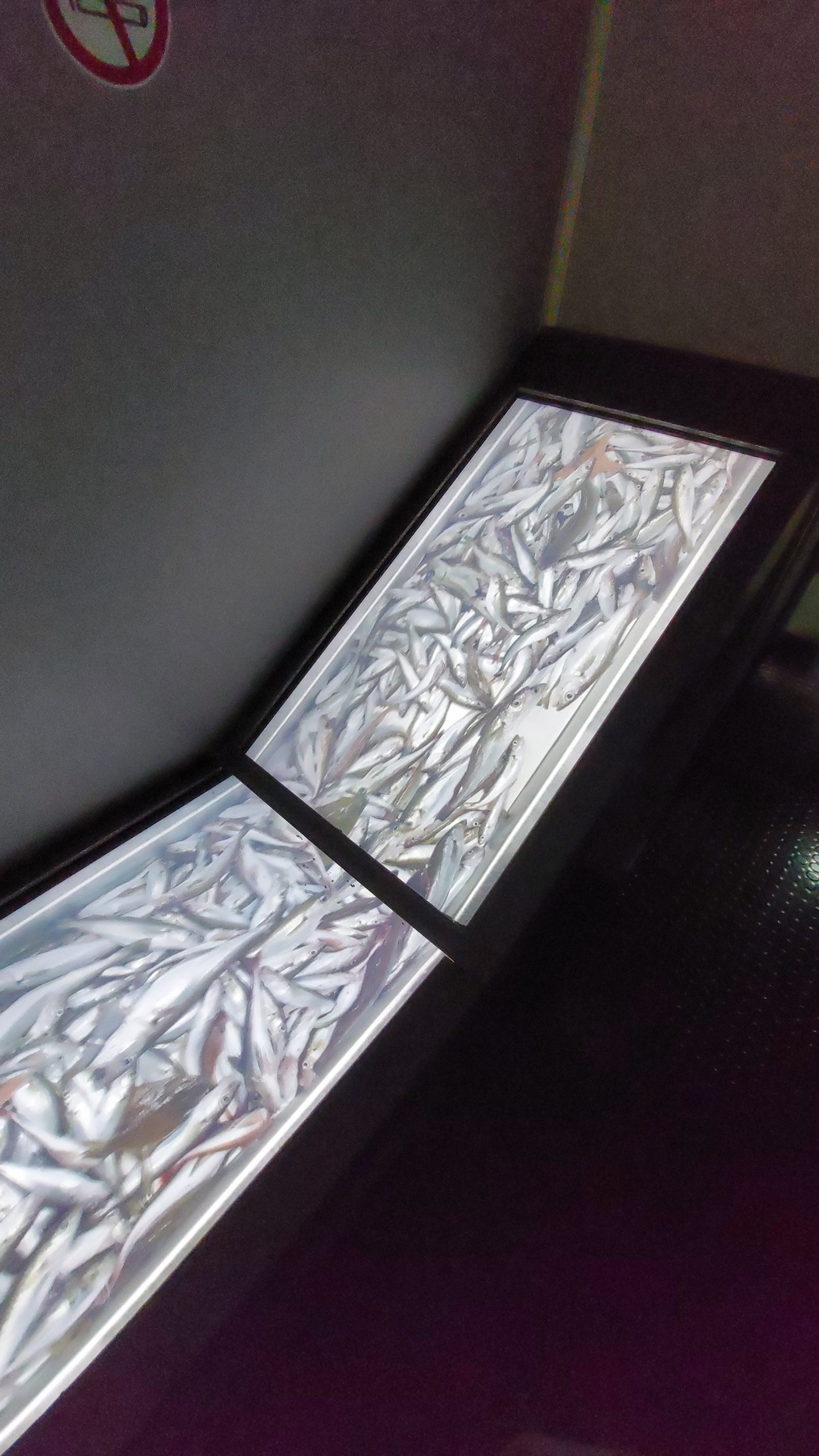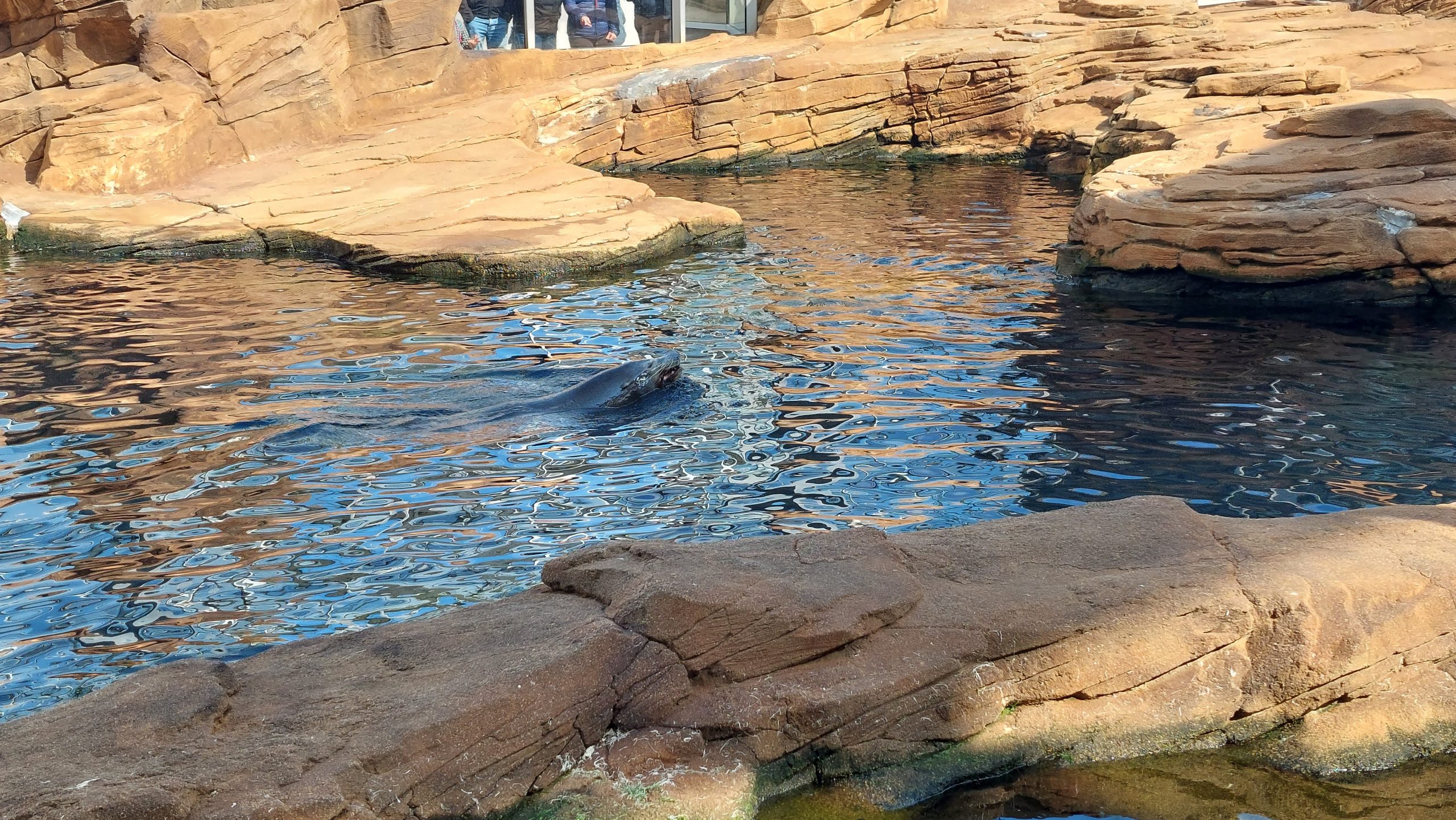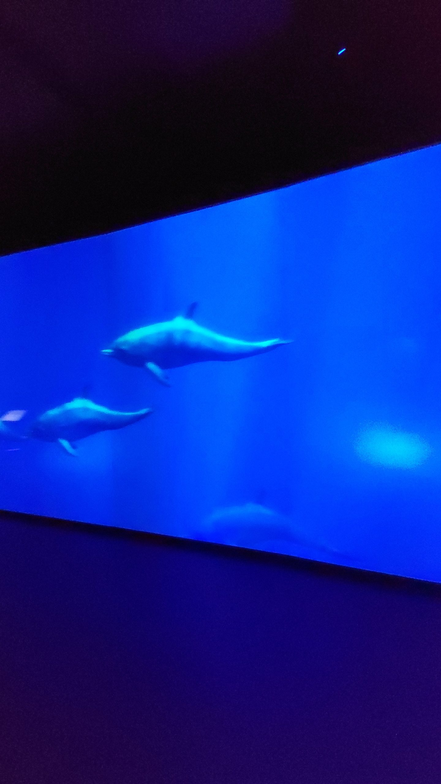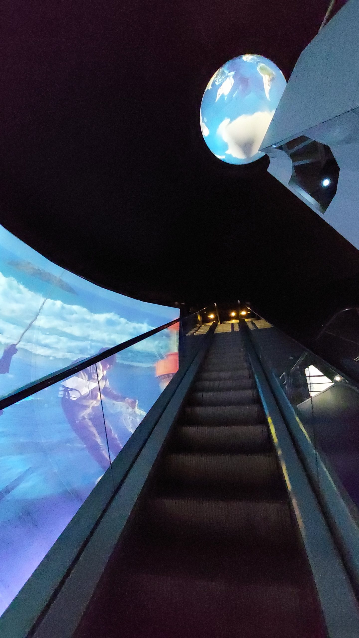 Über eine Rolltreppe mit jeder Menge Meeresanimationen ging es für uns als erstes Tief ins Meer hinein. Während man im „freien Meer“ noch einen Haikäfig betreten kann und über eine Videoleinwand ganz nah an Weiße Haie kommt, wurde es dunkler je tiefer wir in diesen Ausstellungsraum eintauchten.
