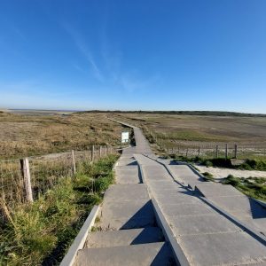 Vom Parkplatz aus geht es über den Deich zum Strand.